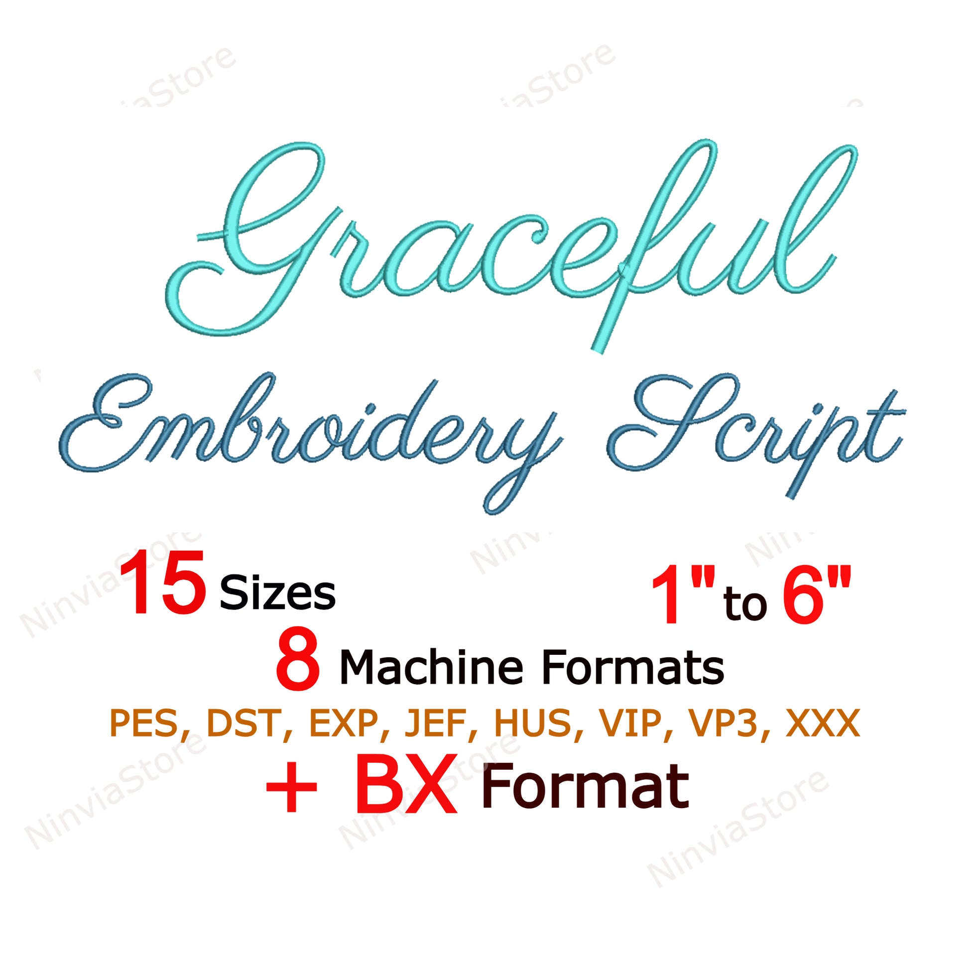 Diese Schriftart im BX-Format und in Maschinenformaten (pes, dst, exp, jef, hus, vp3, vip, xxx) ist in 15 Größen erhältlich: